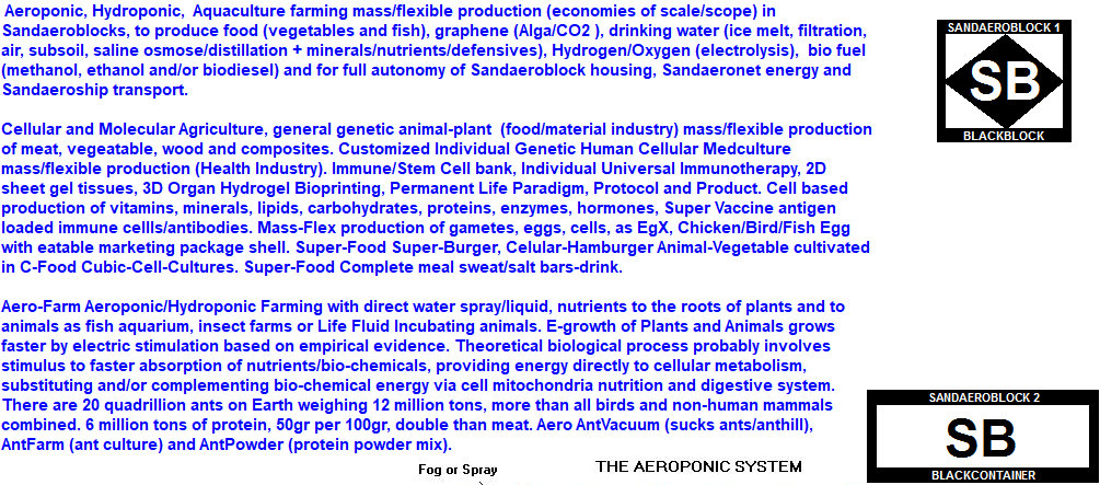 SANDAEROFARM, indoor climate control Sandaeroblock (carbon/glass/metal/polymer composite and solar panel/film/glass container), multilevel aeroponic agriculture, fish/algae aquaculture, multilevel solar, wind, thermal and bio energy: Sandaeroblock (carbon/glass/metal/polymer composite and solar panel/film/glass container) applied to farming to become a Sandaerofarm and energy/sanitation Sandaeronet (solar-wind-bio-thermal energy and water): Indoor climate control, multilevel container stacking/pile-up/down (underground), aeroponic agriculture with water aerosol on roots as lettuce foliage fixed on a light biodegradable/recyclable composite/polymer/polystyrene, direct/indirect light, water stored on floor/ceiling/underground container, from natural water stream, piping, condensed from air or groundwater; solar-wind energy on roof of container and above cabled/anchored to container with buoyant units, including inflatable spheres with solar focusing on panel and multi altitude floating wind turbines (geo-solar thermal and bio algae/organic waste optional) with main east-west solar capture if multi-level. Lettuce for example is removed from aeroponic board and placed in water cup long lasting refrigerated bouquet consumed one leaf at a time. ZERO pesticides. Aeroponic is indoor with minimal use of water, multicrops 365 days year. Insects as grasshoppers, flies and ants are actually an additional source of culture and/or capture for sale or as input for fish aquaculture and/or plant organic fertilizer.