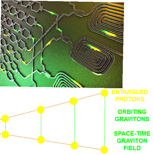 Gravitons orbit photons, mainly forming space-time field, smallest significant quantum of matter- energy. Entangled photons,